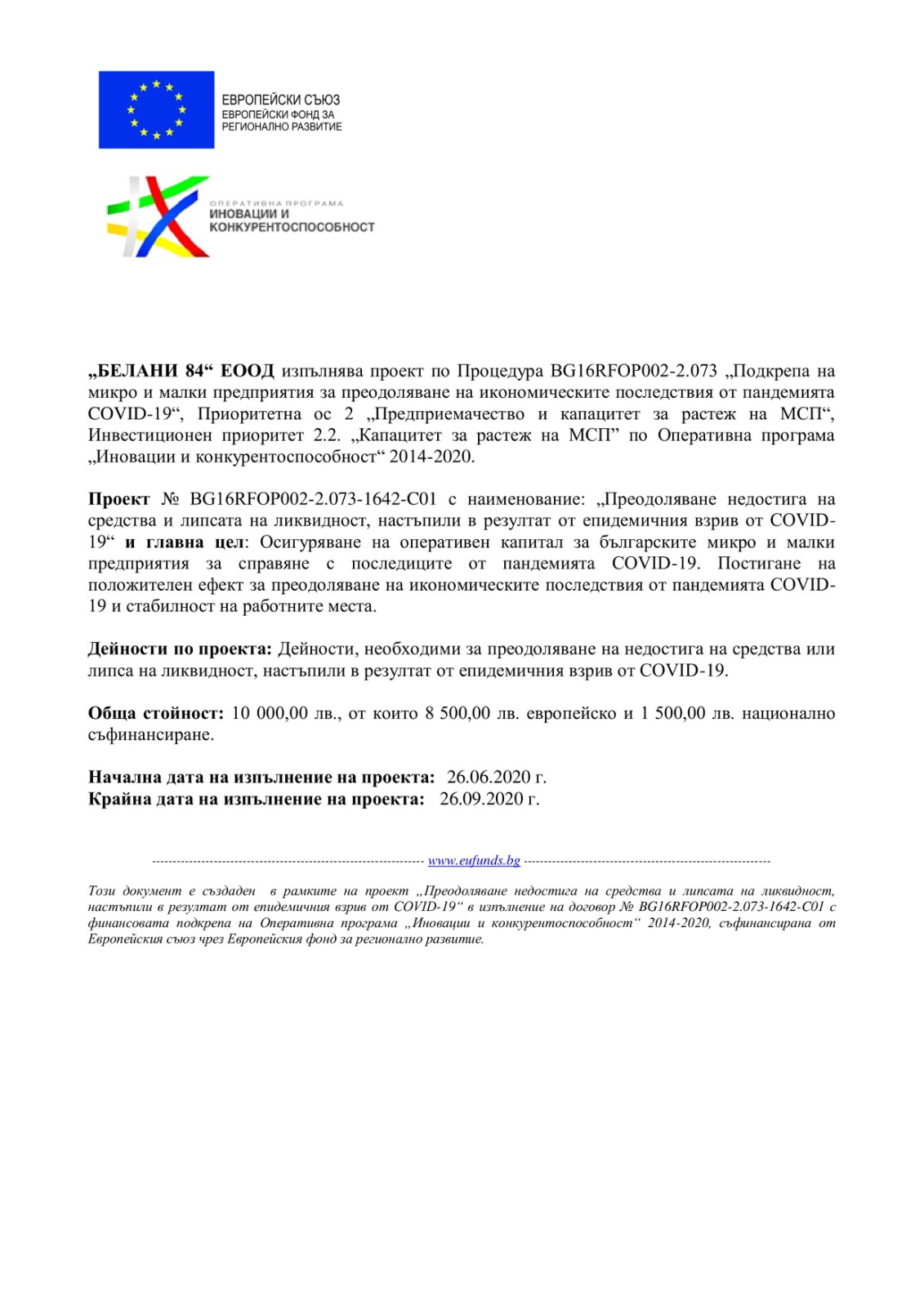 „БЕЛАНИ 84“ ЕООД изпълнява проект по Процедура BG16RFOP002-2.073 „Подкрепа на микро и малки предприятия за преодоляване на икономическите последствия от пандемията COVID-19“