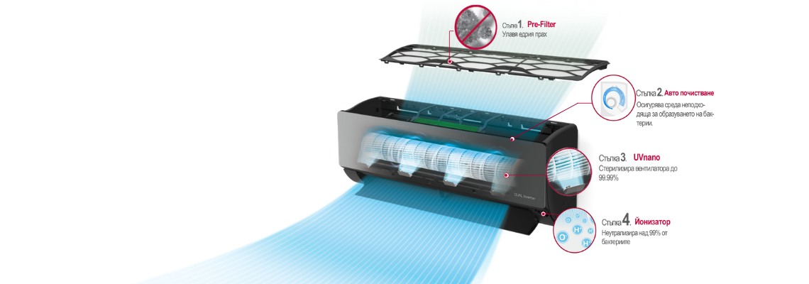 Системата за пречистване, с която климатиците са оборудвани ще се състои от 4 основни компонента: