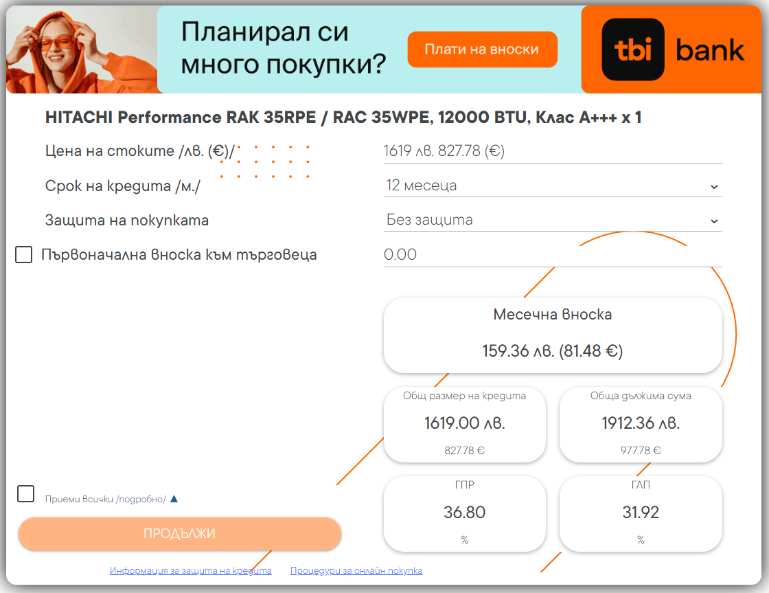 "Белани 84" предлага на своите клиенти бърз и лесен начин за пазаруване на изплащане, като тази опция позволява да не идвате до нашия офис, за да вземете желаната от Вас стока. Разполагаме с достъпна и удобна опция за кандидатстване за кредит онлайн, чрез системата на TBIBank.СЛЕДВАЙТЕ СЛЕДНИТЕ СТЪПКИ: